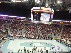 というスケート場でアイスホッケーの試合を見ました。ルールはあまりわかりませんでしたが、どの選手もユニークな名前ばかりでした。