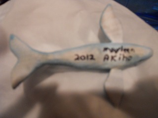 帰宅してから、テレビを見ていたら、Mayleen がティッシュを持って来ました。「開けてみて」と言われたので、開けると、木でできたイルカのフィギュアで、裏に Mayleen と私の名前が書いてありました。「木で形を作ったのが Dad で、色を塗ったのと名前を書いたのが私だよ」と Mayleen が言いました。すっごく嬉しかったです。