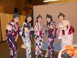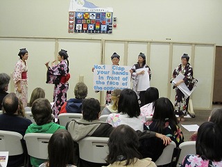 夕方には遂に Sayonara Party が始まりました。浴衣の着付けは素代がみんなのをやってくれました。浴衣に着替えてから、ずっと緊張していました。私のファミリーが来ましたが、Dad がいませんでした。Mom が「あきほ、ごめんね。Dad が仕事で間に合わないかもしれない」と言いました。Dad にプレゼンテーションを見てもらいたかったので、ショックでした。 始まるまで Mayleen と椅子に座っていたら、いきなり Mayleen が私の腕をつかんで、目をウルウルさせて「さみしい」と言ってきました。私は Sayonara Party では泣かないと決めていたのですが、涙をこらえきれず、トイレに駆け込みました。トイレで涙をふいていたら、七恵が来てくれて、「がんばろう」と言ってくれました。席に戻り、Sayonara Party が始まり、プレゼンが始まりました。私たちのプレゼンの順番は最後でした。私が緊張しながら順番を待っていたら、2組目の途中で Dad が来てくれました。とても嬉しかったです。私たちの順番が来て、チームKGで円陣を組みました。ちなみに「チームKG」とは、「困ったガール」という意味です。私たちは「相撲」についてのプレゼンだったので、相撲のかつらをかぶりました。プレゼンは予想以上に緊張して、私はド忘れしてしまいましたが、みんながフォローしてくれました。