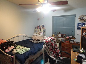 おしゃれな青い家でした。室内もオレンジのランプで、はじめは日本との照明の明るさの違いに驚きましたが、とにかく落ち着く空間でした。部屋はブルーの壁紙で、とてもかわいい部屋でした。ベッドの高さがとても高く、驚きました。 私たちが勉強するスタディセンターからは車で20分ほどかかり、一番遠い家だったと思います。