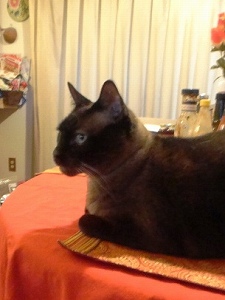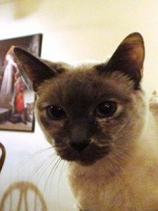 Belle | 茶色のメス猫で、「おばあさん」という別名があります。ぽっちゃりしていてかわいいのですが、触られるのが嫌いで、怒りっぽい性格です。ホストファミリーからは、あまり撫でないようにと言われていました。膝の上に乗ってくれたときは感激でした。 |