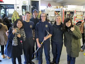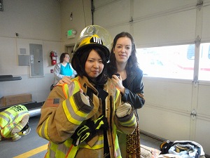 週末の出来事についてみんなで発表した後、質問事項のチェックと練習をして、消防署を訪問しました。みんなで質問したり、署内の見学をさせてもらいました。日本と違い、アメリカの消防士のほとんどはボランティアで、大工や看護士と兼務しているということにとても驚きました。防護服を着せてもらい消火ホースも体験しました。着ている際に「日本では消防士は人気?」と聞かれ、準備していったことを話すことができたので、うれしかったです。