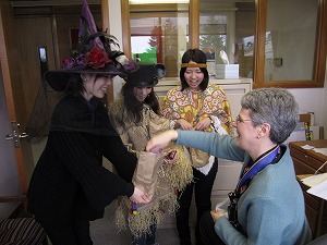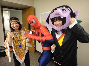 午前中はアメリカの祝祭日について学びました。ハロウィンは日本でもよく聞きますが、みんなで衣装を着たりお菓子をもらいに行ったりと、実際に体験するのは初めてだったので、とても楽しかったです。私はヒッピーが流行った頃の恰好をしました。選んでいたときは派手だと思いましたが、みんなの衣装の方が何倍も派手で安心しました。