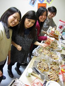 午前中はジャーナルとフォトフレーム作りの続きをし、午後からは日本とアメリカの料理をつくり、食べ比べをしました。ピザとお好み焼きを同時進行で作るのは本当に大変でした。その後、Kathleen