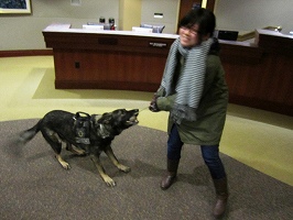 午前に市役所と警察署に行きました。市役所と警察署は同じ建物の中にありました。最初に、市役所について話を聞いたり所内の見学をしたりしました。。サケの赤ちゃんを水槽で育てて、大人になったら川に帰すそうです。次に、警察官の話を聞きました。警察犬を連れてきてくれて、おもちゃで引っ張り合いをしました。とても力が強く、どこまでも引っ張られました。警察官がおもちゃを「離せ」と言うとすんなり離していたので、やっぱりお利口さんだなと思いました。その後、裁判所にも行きました。裁判官に会うことができ、裁判の様子も見学することができました。貴重な体験をしました。