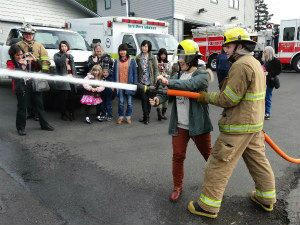 午前はスタディセンターで、週末は何をしていたのかを話しました。それぞれの家庭ごとに過ごし方が違っているのを聞いていて、おもしろかったです。午後は消防署を訪問しました。日本で考えた質問を消防署の方にしました。防火服を実際に着たり、ホースを持って放水の体験もさせてもらいました。