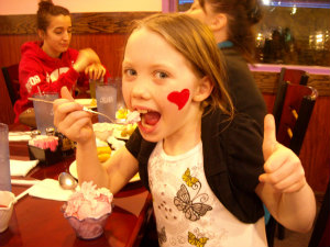 が家の中を案内してくれました。当日がバレンタインデーだったということもあり、Mayleen のほっぺたには大きなハートがあり、とてもかわいかったです。その後、みんなで食べ放題に行きました。中国系のお店で、お寿司など日本食もありました。みんな焼きそばが好きらしく、たくさん食べていました。