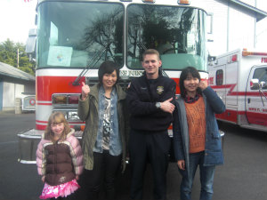 午前中は、スタディセンターで勉強をし、午後から消防署を訪問しました。消防士の方々の話を聞いたり、質問に答えてもらったりしました。女性の消防士の方もいて、とてもかっこよかったです。その後、実際に防火服を着せてもらったり、ヘルメットをかぶったり、消火器具を触らせてもらったり、消防車に乗せてもらったりしました。そして実際のホースで放水させてもらいました。水の勢いがすごくて、足で頑張って踏ん張っていました。すごく貴重な体験ができ、そしてかっこいい消防士の方々と写真をとれて嬉しかったです。
