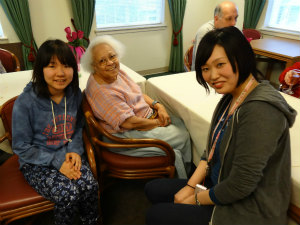 その後は、老人ホームに行って、日本の歌 (雨降り、かえるの歌など)や日本語の数の数え方