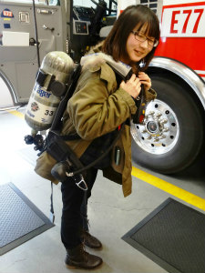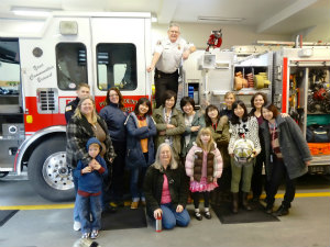 の授業では、お互いの週末について話しました。午後は消防署を訪問しました。いろいろなお話を聞かせてもらったり、道具や消防車を見せてもらいました。アメリカの消防士さんはボランティアが多いことと、比較的若い人が多いことに驚きました。消防士の皆さんはとてもさわやかでした。