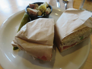 その後アンティークなお店が並ぶ通りに行って、お昼にサンドイッチを食べました。時差ボケであまり食欲がなかったので、半分のサイズのものを注文しました。中に挟む具は全部自分の好きなものを選べました