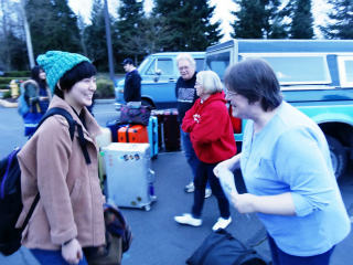 出発当日、すっぴんで新潟駅に行きました。私はコンタクトレンズを装着していましたが、約1日半着けたままになるので、ぎりぎりまで着けないほうがいいかもしれません。成田空港ではスーツケースを受け取り、重量を量ります。2、3キロ余裕を持った方が安全です。日本からワシントン州までは約9時間かかります。機内では寝たくても足が痛くてほとんど寝ることができませんでした。到着日は1日中活動することになるので、