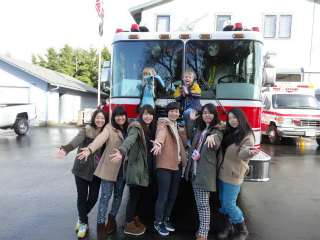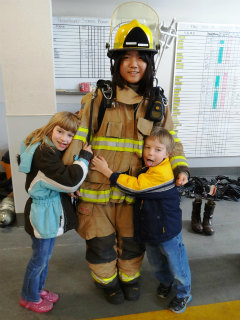 を訪問しました。事前に用意していた質問をしたり、消防服を着たり、放水体験もしたりしました。