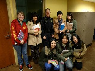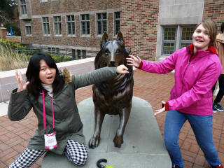 Colledgeに行き、留学していた夕樹ちゃんと珠実ちゃんと半年ぶりに再会しました。二人ともアメリカに馴染んでいて英語がペラペラで、とってもかっこよく見えました。この時一瞬だけ日本語で話す許可がおりたので、少しだけ日本語でお話しました。その後は大学内を見学しました。前の日に見学したワシントン大学とは違い、自然がいっぱいの大学