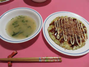 はタコ焼きが食べたかったらしいのですが、タコ焼き器がないので、お好み焼きの材料を買い揃え、家に帰ってからタコの入ったお好み焼きと味噌汁