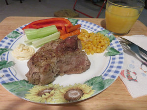 帰宅してから、家にあるオーブンで焼いた大きなお肉を食べました。普段そんなに大きなお肉を食べないので、改めてアメリカの食事だなーと感じました。食後、Gwen と一緒に再びスタンプやシールを使いバースデーカートを作りました
