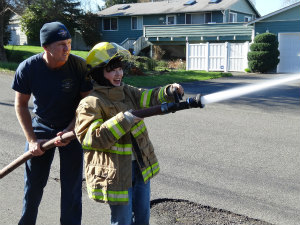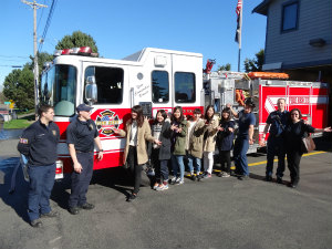 消防車前で |