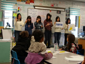 小学校で数字のプレゼンでした。プレゼンではだんだん子ども達のリアクションがよくなり、たくさん練習した甲斐があったなと思いました。また、子ども達の名前をカタカナにして教えてあげたり、折り紙を一緒に折ったりもしました。カタカナを教えてあげた時、すごく喜んでくれて何回も練習している姿がとてもかわいかったです。プレゼン後、外で遊具で遊んで、ランチも一緒に食べました。子ども達はとってもパワフルで疲れましたが、充実した1日