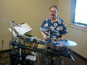 のドラムの演奏 を聞きました。周りの人はバンドの演奏に合わせて歌っていました。