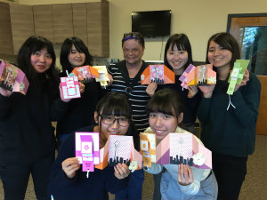 この日はクラフトを作りました。午前は、メモリアルジャーナルとフォトフレームを作りをしました。野中先生が持ってきてくれた写真と、Laura が持ってきてくれたシールなどの材料を使って作りました。午後には、まいのホストマザーのJane が来て、クラフトを教えてくれました。2枚のカードを作りました。1つはホストファミリーに向けて作り、もう1つは家に持ち帰るために作りました。