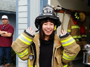 午前中はスタディセンターでお金の数え方を教えてもらいました。日本円とは全く数え方が違うので、慣れるまで大変でした。アメリカへ行く前に、少し予習をしておくと良いでしょう◎ 午後は消防署へ行きました。まずは説明を聞いたのですが、ほとんど理解できませんでした。その後、外に出て消防車に乗ったり、防火服を着たり放水をしたりしました。女性の消防士が、早着替えも見せてくれました。 Gwen が帰りに Hannah が働いているダイビングショップへ連れて行ってくれました。たくさんのダイビンググッズや写真があって、とても楽しかったです。