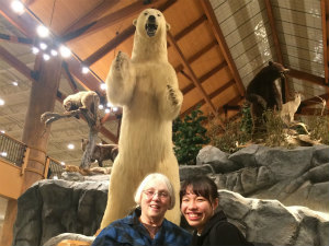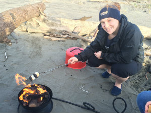 海へ行き凧をあげました。思っていたよりも難しくて、慣れるまでに3回くらいかかりました。Hannah はすごくおっきい凧をあげていて、すごいなぁ〜と思いました。お昼はバーガー屋さんへ行きました。あまりお腹が減っていなかったので、クラムチャウダーのSサイズを頼んだらすごく小さくて驚きました。アメリカは、料理のサイズ感覚が日本とは違い、いつまでたってもよくわかりませんでした。お昼を食べた後、また海に戻り凧をあげたり、クッキーにチョコとマシュマロを挟んで食べるスモアを作って食べたりしました。帰りに、アウトドア用のアイテムがたくさんあるお店に行きました。アウトドアショップなのに水槽があったり、ワシントン州で見ることができる動物の等身大の置物がおいてありました。