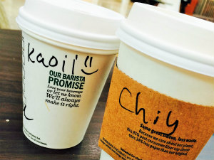 午前はかおりと Gwen と一緒に大きいショッピングモールへ行きました。9時半に着いたのですが、開店が11時からだったので、近くの小さいショッピングモールやスタバへ行って時間を潰しました。スタバの店員さんがかおりと私の名前を書いてくれましたが、かおりの名前をちょっと間違えていました。