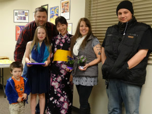 Hi, Dad, Mom, Tiara, Joseph, Maymay, Elijah, Tallon and Bella! How's it going? Thank you for hosting me for three weeks. I had a wonderful time with you. Thank you for cooking deliciuos meals for me. I really enjoyed your meals. Thank you for taking me to many places too. I enjoyed camping very much. It was a very good memory for me. I was also glad to go to the aquarium with the whole family. I would like to go back to Seattle and see you again. I want to talk with you fluently, so I will study English harder. Thank you for caring about me for three weeks. I appreciate your kindness. See you again! From Shiho |