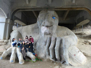 シアトル観光をしました。ワシントン大学やチョコレート・ファクトリー、スペースニードル、パイク・プレイス・マーケットへ行きました。ワシントン大学はとても大きく、豪華な建物でした。特に、図書館がとても素敵でした。チョコレート・ファクトリーでは、様々な味の板チョコを売っていました。この日は、スペースニードルが貸切られていたため上がれませんでした。パイク・プレイス・マーケットには、たくさんお店があり、賑やかで活気がありました。そこでメンバーでお揃いのTシャツやお土産を買いました。また、移動途中にトロールの巨大な像があり、驚きました。