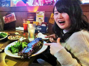 夜、 Laura と奏子、彼女のホストファミリーと一緒にステーキを食べに行きました。落花生の殻が店中に落ちていて驚きました。無料のパンが甘くておいしかったです。ステーキは骨付きを注文したため食べることが大変だったけれど、おいしかったです。
