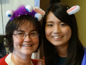 It was the day for American holiday activites. We hunted eggs for Easter, and ate Thanksgiving dishes for lunch. Mai's hostmother Jane brought us a turkey. All the dishes were so delicious. After lunch, we had a Halloween party. We borrowed a costume from our host family, and wore one. We said “Trick or Treat?” to Laura and got some candies. We then baked cheese cupcakes with strawberry sauce. Moe brought us a cherry pie and Mai brought us a pumpkin pie. Both pies were so dilicious, especially the cherry pie. I ate too much. After school, I saw an ice hockey game with Moe, Mai and Mai's host family. I had never seen a hockey game before. It was so fun and exciting.