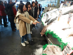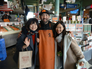午後はスターバックス1号店に行きました。ラズベリー風味のコーヒーを試飲することができ、とてもクリーミーでおいしかったです。ゆみちゃんがお土産へたくさん買っていて、袋の大きさにみんなびっくりしました。その近くにパイク・プレイス・マーケットという市場があり、多くのお客さんで賑わっていました。新鮮な魚や、お花、お肉などいろいろなお店が1本道に並んでいました。野中先生がいきなり魚屋の近くまで連れて行き、私に生きている魚をさわらせようとした瞬間、魚が飛び跳ねて心臓が飛び出るくらい怖かったです。みんなでシアトルTシャツを買うことができたし、お土産にシアトルグッズをいっぱい買うことができ、とても楽しい時間でした。シアトルマリナーズのショップにも行くことができて、私の好きな “IWAKUMA” のユニフォームの写真を撮りました。セーフコ・フィールドの前で看板の選手と同じポーズをして、シュールな写真も撮りました。最後に日本の食材を売っているスーパーの宇和島屋に行きました。思っていたより本当に日本そっくりのスーパーでした。私はそこでホストファミリーに作る日本料理の食材を買いました。スーパーの中には紀伊国屋書店が入っていてジブリの音楽が流れていました。たくさん歩いていろんな場所に行くことができて楽しかったですが、疲れて車の中では爆睡でした。