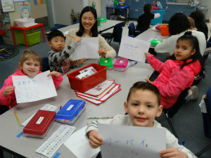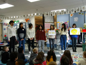 朝から小学校へ行きました。アメリカの子供たちに10色の色のプレゼンを発表しました。1回目のプレゼンは緊張したけれど、アメリカと日本のハーフの子が即答で答えてくれてびっくりしました。多くの子供たちが積極的に手を挙げてたくさん質問してくれて嬉しかったです。質問に私たちが答えるとすぐリアクションしてくれて、楽しくやることができました。また、一人ひとりの名前をカタカナで書いてあげたら、喜んで何度も練習してくれました。アメリカの子供たちは、とても積極的でパワフルで圧倒されました。特にお昼の時間には多くの子に囲まれたくさんお話をしたのですが、みんなが同時に話すので聞き取るのが難しかったです。ご飯はみんなそれぞれ違うものを食べていて、私の隣の子はマスタードだけのパンを食べていてほんとうにびっくりしました。ランチの後は外で鬼ごっこをしたりして遊びました。みんなかわいくて良い子たちばかりでした。体力を使ってとても疲れたけれど、充実した1日でした。