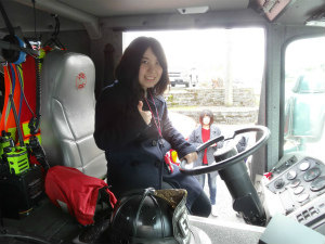 この日は発音練習をしました。”R” と ”L” の違いなど練習し、特に”would” の発音が難しかったです。午後は消防署へ行きました。かっこいい女性の消防士さんたちが出迎えてくれました。防火服を着させてもらい、放水を体験しました。みんなで考えた質問もしました。消防署のみなさんは優しい方でした。