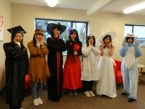 午前は日米の祝日について話しました。お昼にはそれぞれのホストファミリーが用意してくれた料理を食べました。Alissa はパンプキンパイやピーカンバーなどたくさんの料理を作ってくれました。食後にはみんなでハロウィンの仮装をして楽しみました。私の衣装は Remi が貸してくれました。