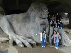 この日は一日観光をしました。午前はワシントン大学に行き、図書館を見学しました。大学にはとても大きなジョージ・ワシントンの銅像がありました。その後にフリーモント・トロールという巨大な像と Theo というチョコレート屋さんに行き、いろいろな種類のチョコを試食しました。変わった味のチョコレートが多かったです。その後にスペースニードルに行きましたが、天気が悪かったので、上からの眺めはイマイチでした。その後に2度目のスターバックス1号店へ行きコーヒーを買いました。平日でしたが混んでいました。授業で習ったパイク・プレイス・マーケットやガム・ウォールにも行きました。たくさんのお店があり、みんなでおそろいのTシャツを買いました。最後に宇和島屋という日本の食材が売られているお店に行き、ホストファミリー用にお茶のパックを買いました。日本の雑誌や漫画も売っていました。とても楽しい1日だったのですが、車に酔ってしまい、家に着くと寝込んでしまいました。しばらくしてからリビングに戻るとみんなが心配してくれていて、申し訳なかったです。