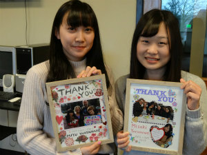 午前はホストファミリーにプレゼントするフォトフレームを作りました。Laura はたくさんのシールやクラフトハサミを持っていて驚きました。
