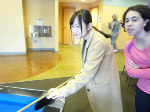 午前はホストファミリーとピックルボールをしました。途中で秋菜ちゃんと秋菜ちゃんのホストファミリーも来ました。みんなでビリヤードもしましたが、みんな上手でした。