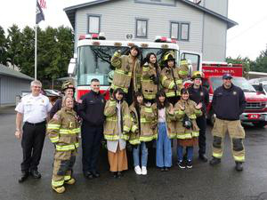 午前中は、消防署の見学に行きました。消防署の皆さんに質問をして答えてもらいました。その後は、実際に防火服を着せてもらいましたが、すごく重たかったです。また、消防士さん同士の早着替え対決を見たり、消防車や救急車に乗せてもらったり、放水体験もさせてもらいました。なかなかできない貴重な体験ができ、とても楽しかったです。アメリカの消防士のみなさんは、とてもやさしくかっこよかったです。