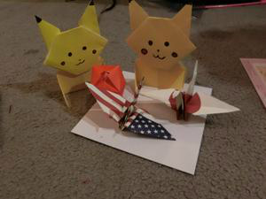 午後は、折り紙をしました。 Geni や Alissa と一緒にピカチュウや鶴を作りました。そしてみんなが揃っていたのでお土産を渡しました。喜んでくれたので嬉しかったです。夜は、 Ralph の叔母の Loran が来ました。Loran の誕生日だったのでチェリーパイを作り、みんなで食べました。サクランボのケーキでとても甘くて美味しかったです。