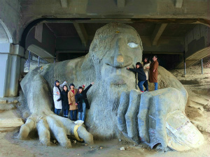 午前中はワシントン大学に行きました。大学の中にはボウリング場や大きなコンビニもあり、図書館は、「ハリーポッター」の食堂みたいに広かったです。大学のあとには、橋の下のトロールを見に行きました。橋の下に大きなトロールがあってびっくりしました。その後、シアトルで、ハンバーガーを食べました。アマゾンのオフィス、スターバックス1号店、ガムだらけの壁や有名な市場へも行きました。日本にない風景をとても楽しめました。