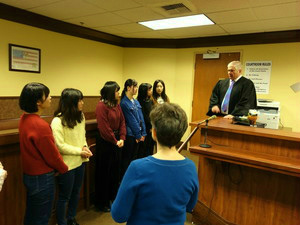 午前中は警察署で質問したり、署内を見学したり、車を見せてもらったりしました。アメリカの警察署は広くてかっこよかったです。その後は裁判所で裁判官になりました。