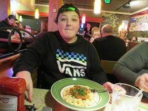 夕ご飯は外食でした。Bill と Debbie 、 Austin と4人で行きました。私は Austin と同じチキンパスタを食べました。パスタといっても、麺ではなくマカロニで、機内食でも同じようなものを食べました。これがアメリカでいうパスタなんだなと思いました。とてもおいしかったです。