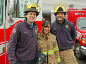 午前中は消防署を訪問しました。自分たちが考えて翻訳した質問を答えてもらった後、実際に消防服を着せてもらったり、消防車の中を見せてもらったりました。他にも、消防服に着替える様子を見せてくれたり、放水の体験もさせてもらいました。