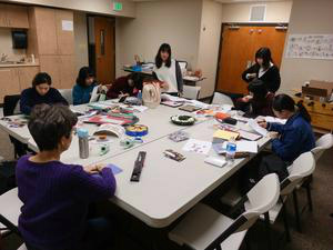 お昼は、各ホストファミリーが持ってきたアメリカンフードを食べました。とてもおいしくてたくさんおかわりをしました。午後は、桜や文字が書かれたのスタンプを使ってカードを作りました。