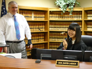 この日は警察署と裁判所へ訪問に行きました。警察署を案内してくれた女性は、18歳にも関わらずとても大人っぽくて驚きました。裁判所では、実際に裁判官の服を着て、裁判官の席に座ることができました。