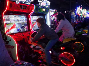 夜は5人で外食に行きました。そのお店にはゲームセンターがあり、Morgan、Logan と一緒にマウンテンバイクやクレーンゲームで遊びました。 Logan がクレーンゲームで取った青いカエルのぬいぐるみをくれて、嬉しかったです。
