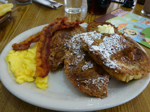 朝ごはんは朝食専門店に行き、スクランブルエッグを食べました。とても量が多く、また大きなパンケーキもついてきて食べきれませんでした。