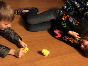 その後、急に停電しました。幸い予備の電力があったので、すぐに Mike が電気を復旧してくれましたが、寒かったので Logan が暖炉を起こすことになりました。本物の暖炉はとても暖かかったです。落ち着いた後、今度は Morgan、Logan と動く小鳥のおもちゃで遊びました。私はコーンが好きだったこともあり、私の小鳥はCorn Champion と名づけられました。