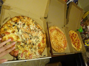 夜ご飯はピザを注文し、後で Lin と取りに行きました。 Morgan、Logan がそれぞれ好きなフレーバーと、私や大人用の計3枚買いました。大人用のピザがとても大きくて驚きました。マッシュルームがトッピングされていておいしかったです。